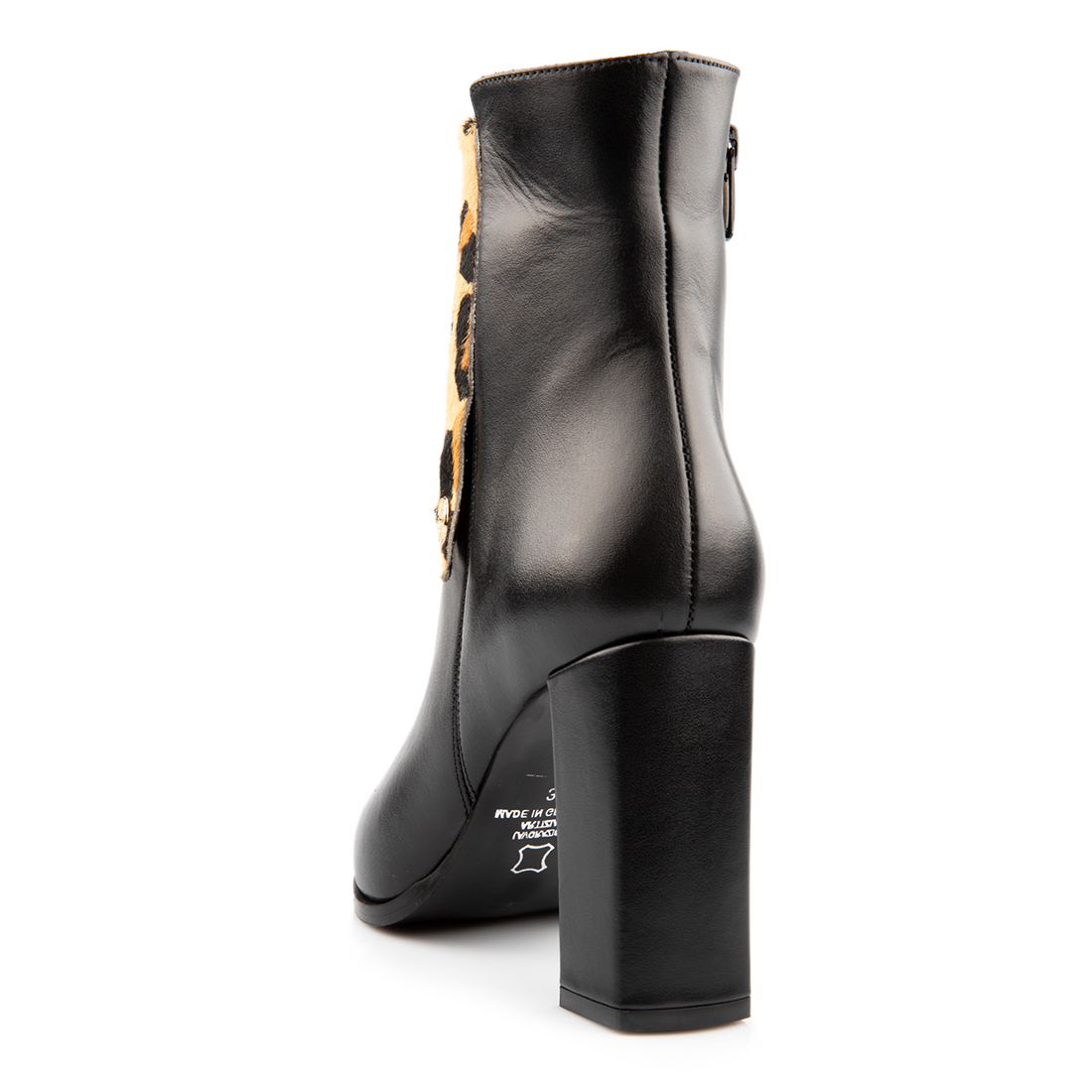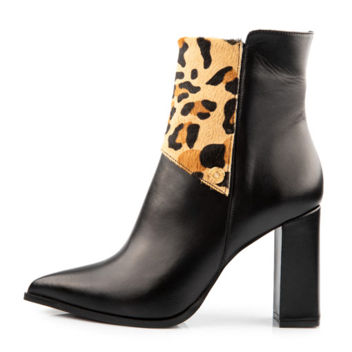 951-90 BOOTIES, Γυναικείο μυτερό μποτάκι ψηλό από γνήσιο δέρμα – άνιμαλ δέρμα (εξωτερικά) εξαιρετικής ποιότητας με εσωτερικό φερμουάρ. Υφασμάτινη επένδυση εσωτερικά (ECO-WARM) και μαλακό (αφρώδες) πατάκι εσωτερικά. Σόλα βάρδουλο για πιο άνετο περπάτημα και χοντρό τακούνι ντυμένο (9,5 εκ).