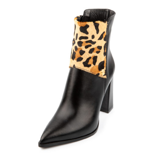 951-90 BOOTIES, Γυναικείο μυτερό μποτάκι ψηλό από γνήσιο δέρμα – άνιμαλ δέρμα (εξωτερικά) εξαιρετικής ποιότητας με εσωτερικό φερμουάρ. Υφασμάτινη επένδυση εσωτερικά (ECO-WARM) και μαλακό (αφρώδες) πατάκι εσωτερικά. Σόλα βάρδουλο για πιο άνετο περπάτημα και χοντρό τακούνι ντυμένο (9,5 εκ).